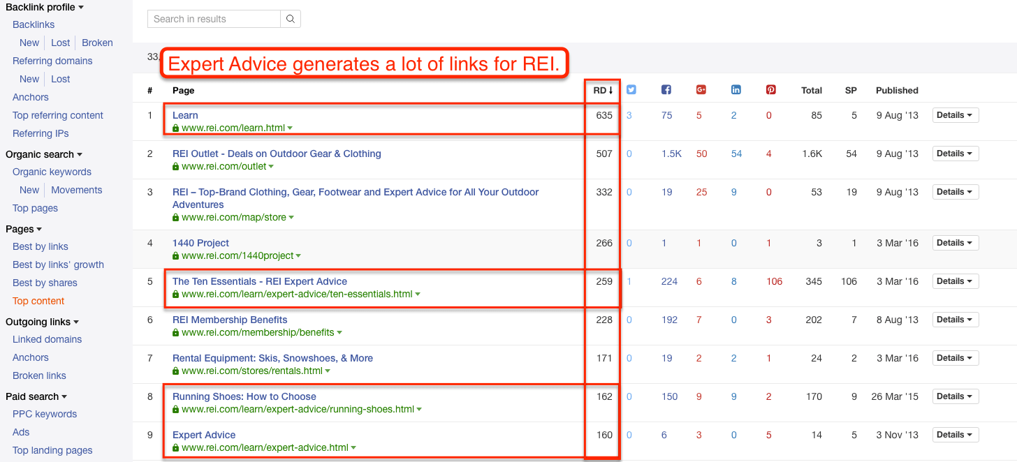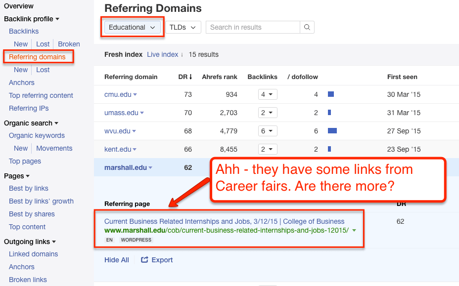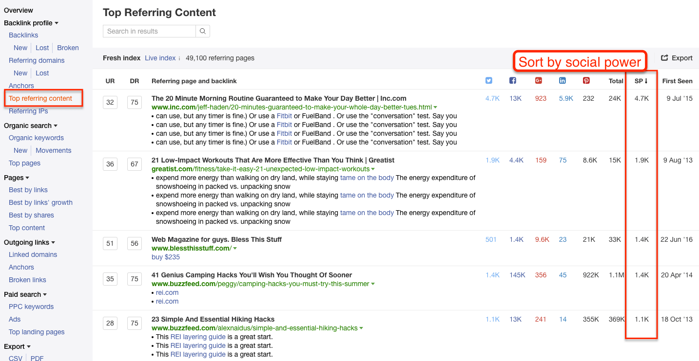 You can use a combination of the Top Referring Content report and the Inbound Links report to identify influential websites that are already linking to competitors and/or industry publications. But you can take it a step further and sort by Domain or URL Rating to figure out who matters the most. In a world of limited resources and time – priorities matter.